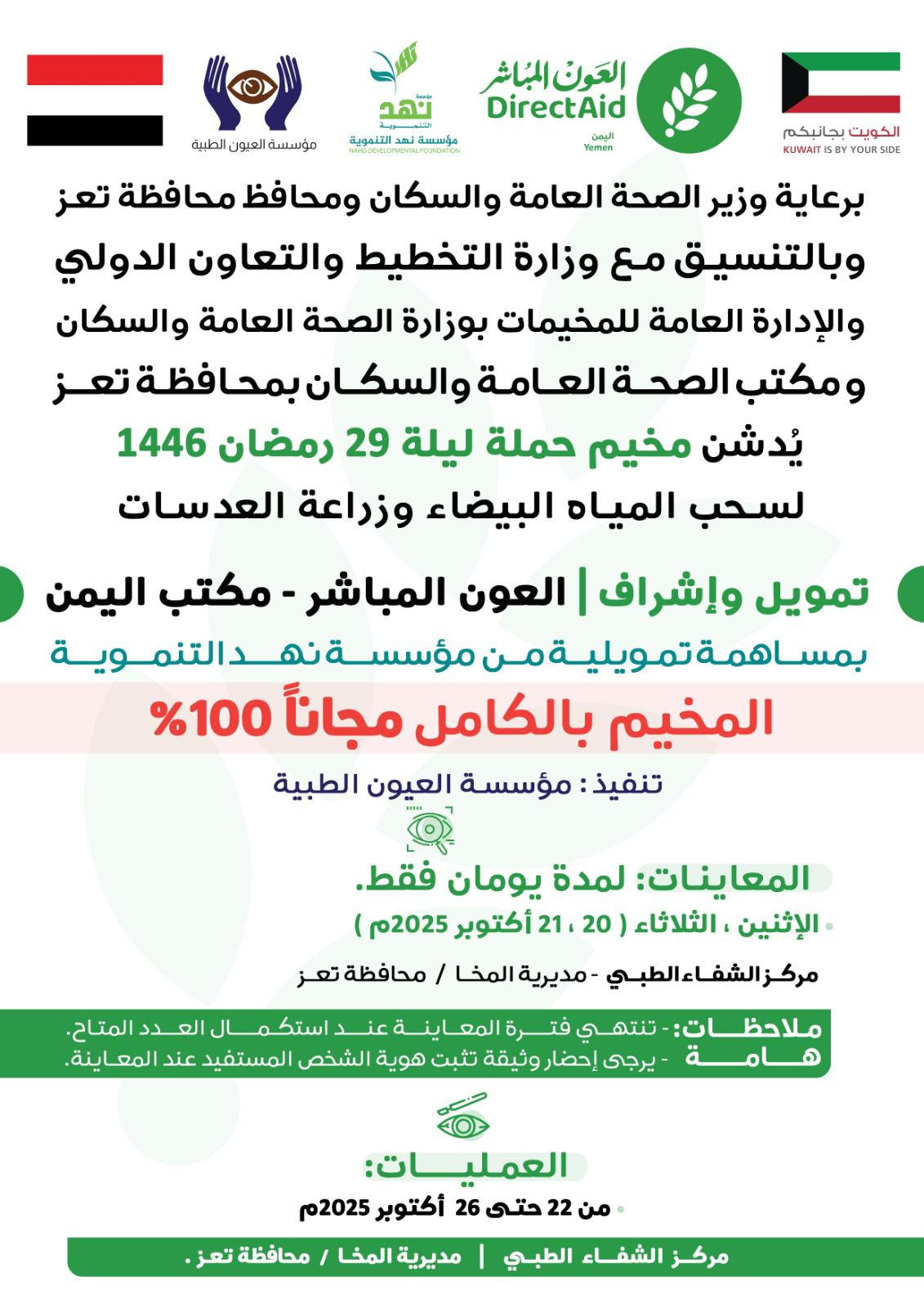 ويقام المخيم الذي يحمل اسم "مخيم ليلة 29 رمضان 1446هـ" في مركز الشفاء للأمومة والطفولة بمدينة المخا، برعاية وزير الصحة العامة والسكان ومحافظ تعز، وبالتنسيق مع وزارة التخطيط والتعاون الدولي والإدارة العامة للمخيمات بالوزارة، وتنفيذ مؤسسة العيون الطبية بتمويل وإشراف من منظمة العون المباشر – مكتب اليمن ومؤسسة نهد التنموية.