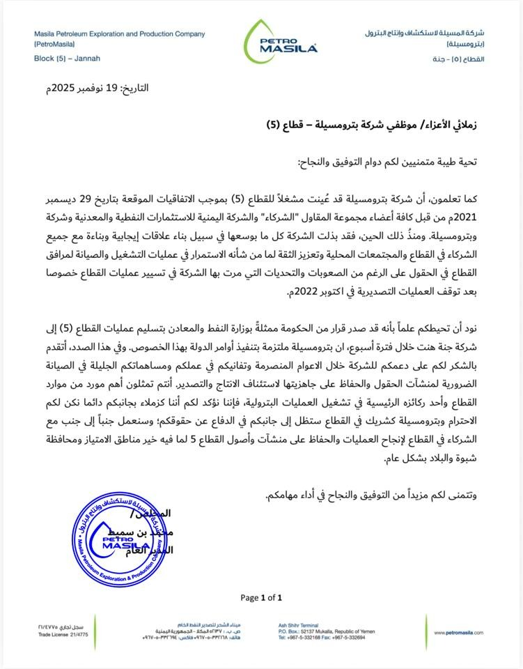 ووجّه مدير الشركة، محمد بن سميط، الأربعاء، خطاباً إلى موظفي بترومسيلة في القطاع، أشار فيه إلى صدور قرار من الحكومة، ممثلة بوزارة النفط والمعادن، بتسليم عمليات القطاع (5) إلى شركة جنة هنت خلال أسبوع.