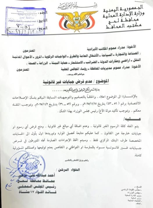 وتأتي هذه الخطوة ضمن جهود السلطة المحلية في محافظة لحج لتنظيم العمل الإيرادي، وتخفيف الأعباء عن المواطنين والقطاع التجاري، وتحسين مناخ الاستثمار، بما ينسجم مع التوجهات الحكومية الرامية إلى تطبيع الأوضاع الاقتصادية في المحافظات المحررة، وإنهاء الممارسات التي أرهقت حركة التجارة والنقل، وأسهمت في ارتفاع تكاليف المعيشة.