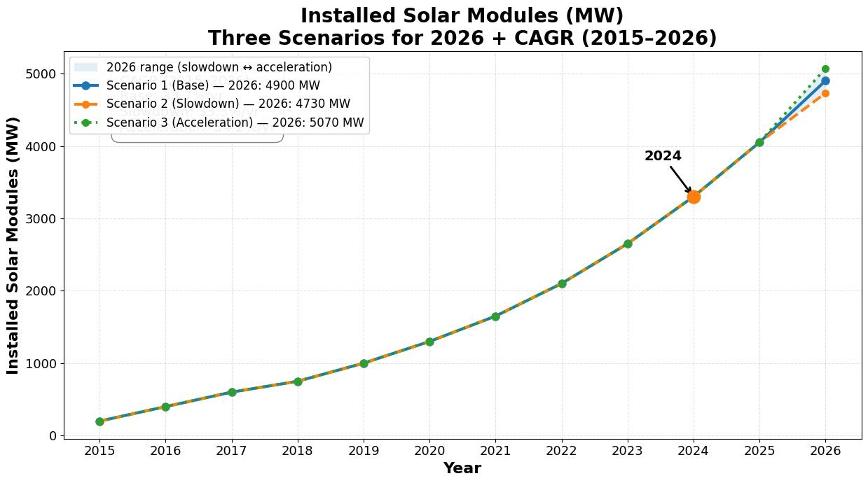 سيناريو أساسي يعكس المسار المتوقع، وسيناريو تباطؤ في السوق (انخفاض في وتيرة التركيب بسبب تحسن الخدمات مؤخراً وازدياد عدد ساعات التشغيل الحكومي في بعض المدن)، وسيناريو تسارع في التركيب في حال تحسن التمويل وتوفر المشاريع والبنية التحتية.