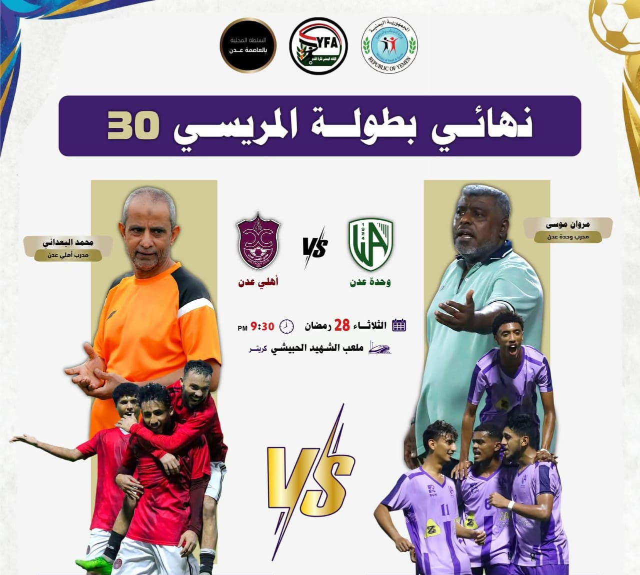 ويجمع النهائي المرتقب بين فريقي وحدة عدن وأهلي عدن في تمام الساعة التاسعة والنصف مساءً، في مواجهة تعد من أقوى مباريات البطولة، نظراً لتاريخ الفريقين وحضورهما اللافت في النسخ الماضية.