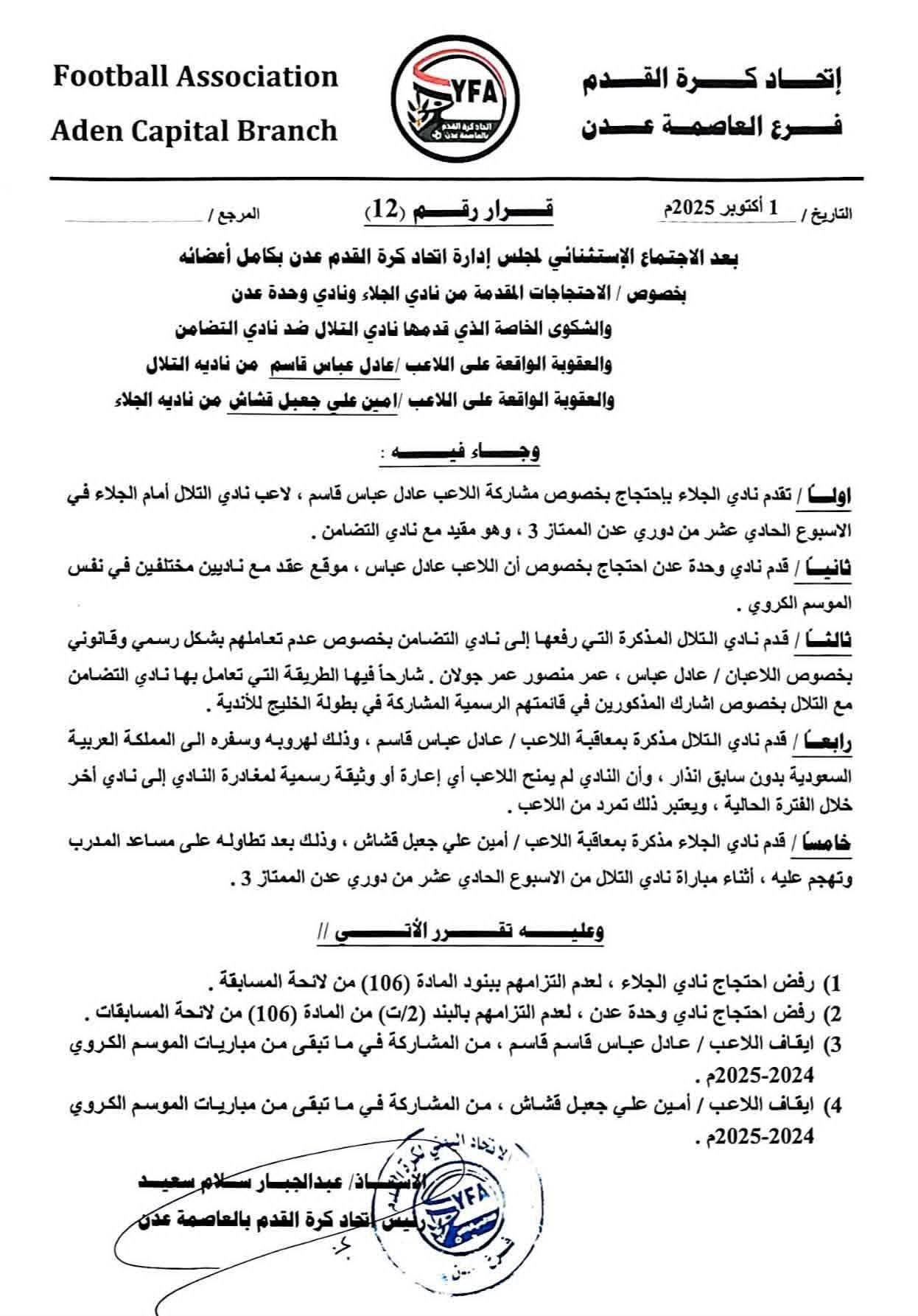 وبناءً على كل ما ذكر، قرر اتحاد كرة القدم فرع العاصمة عدن إيقاف اللاعب عادل عباس. أما بخصوص لاعب نادي الجلاء أمين علي قشاش، فجاء قرار إيقافه بعد مذكرة النادي التي تضمنت تطاوله على مساعد المدرب والتهجم عليه أثناء مباراة الجلاء والتلال، ضمن الجولة الثالثة عشرة من دوري عدن الممتاز.
